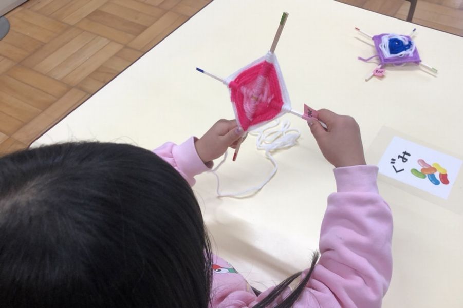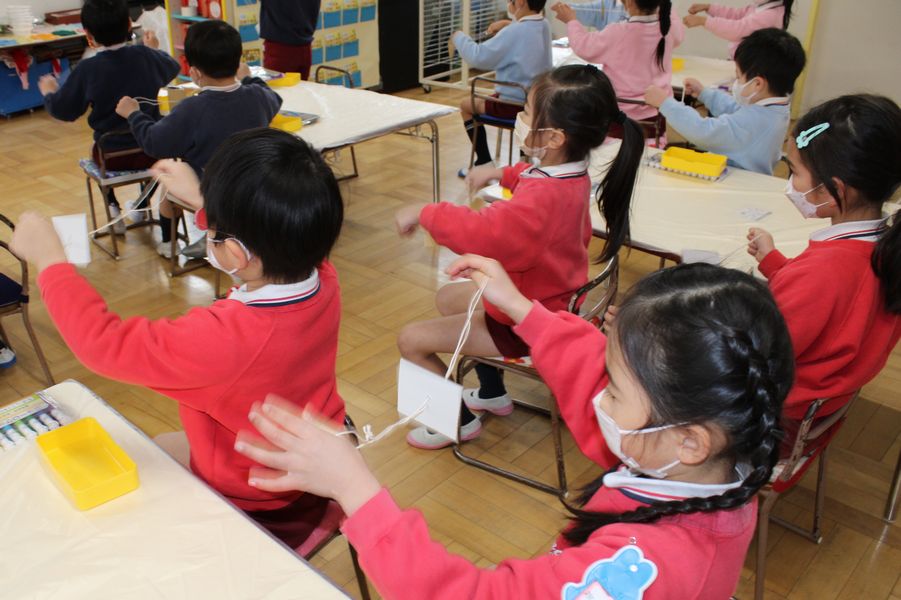年中組は割り箸に毛糸を巻き付ける「十文字掛け」やキルティングと毛糸で作る「ポシェット」、牛乳パックを使った「びっくりカメラ」や年少組と同じく「ワイヤータワー」の4種類を製作しました。