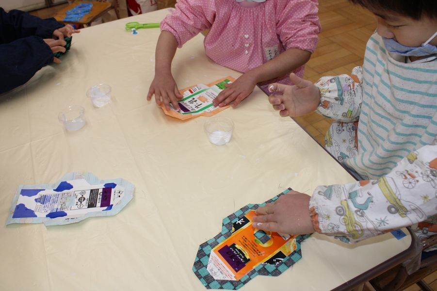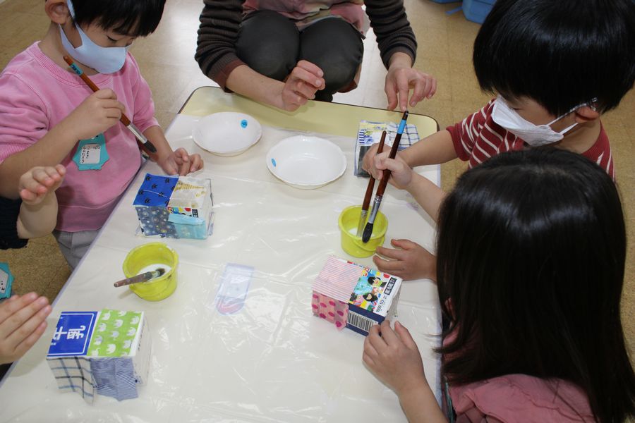 年少組の「ペン立て」は牛乳パックの4面に好みの布を貼りつけます。水分で薄めたボンドが垂れない様に上手に筆を使っている姿が印象的でした。