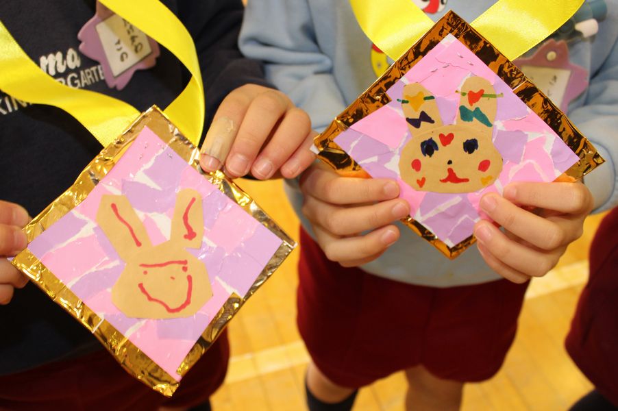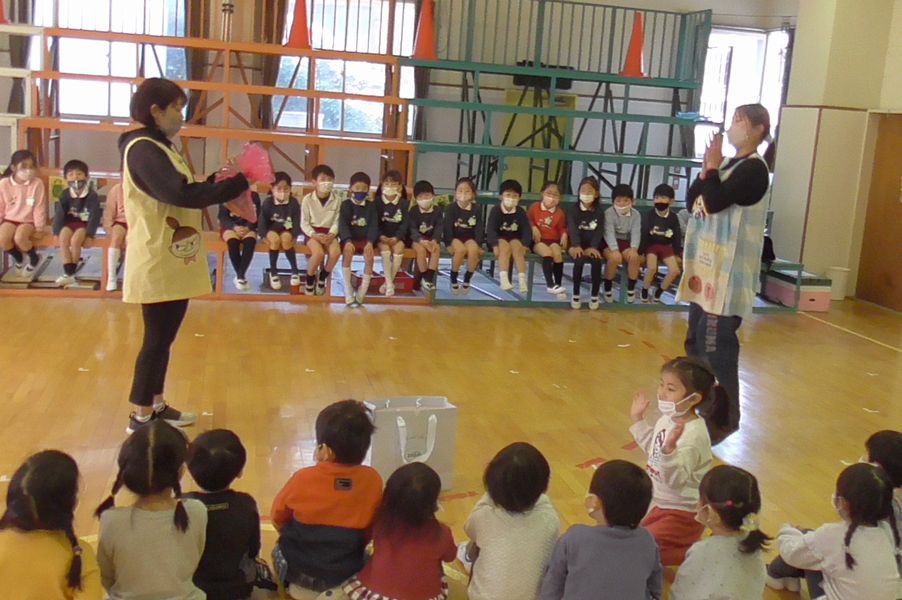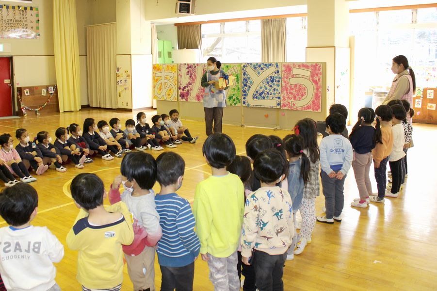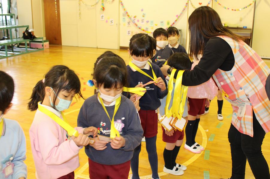 続いて年少組と入れ替わりで年中組が体育室に入場してきました。年中組からは「うさぎ」がデザインされた手作りの金のペンダントがプレゼントされました。