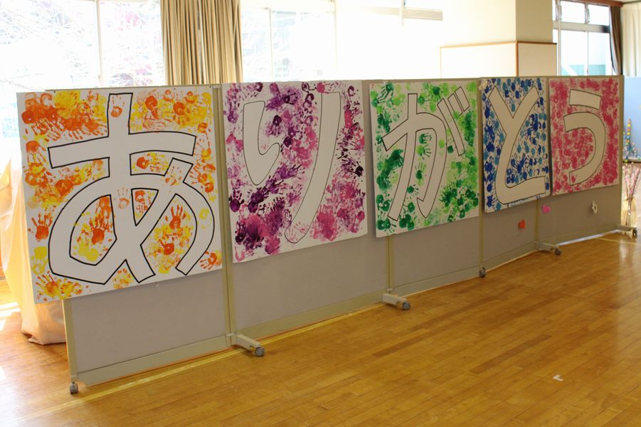 会場となった体育室には、前日年中組がサプライズで用意した飾り付けが前面に施されていました。そして、大きく「ありがとう」の文字も…。