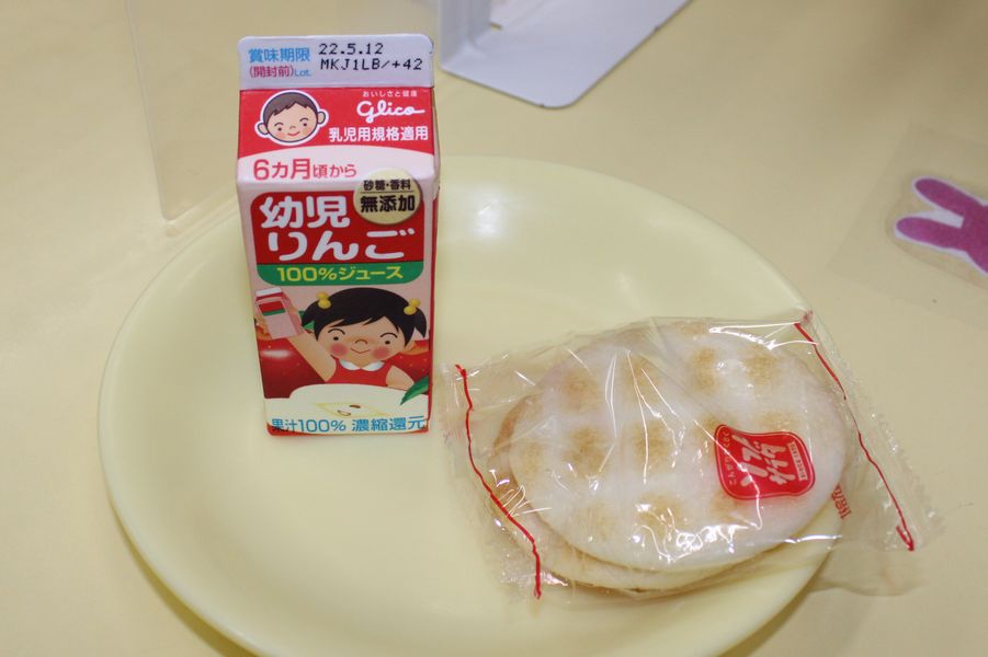 全大会が終わりお部屋に戻るともう一つのお楽しみのおやつがありました。今月のおやつはソフトサラダ煎餅とりんごジュースでした。来月から始まるお弁当の良い予行練習にもなりました。