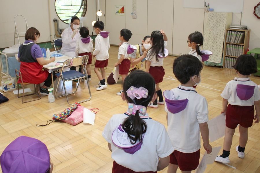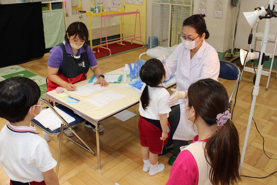 一方、二日目の『歯科検診』は空いている保育室で実施しました。年長組はしっかりとディスタンスをとり「お願いします」「ありがとうございました」の挨拶もできていました。