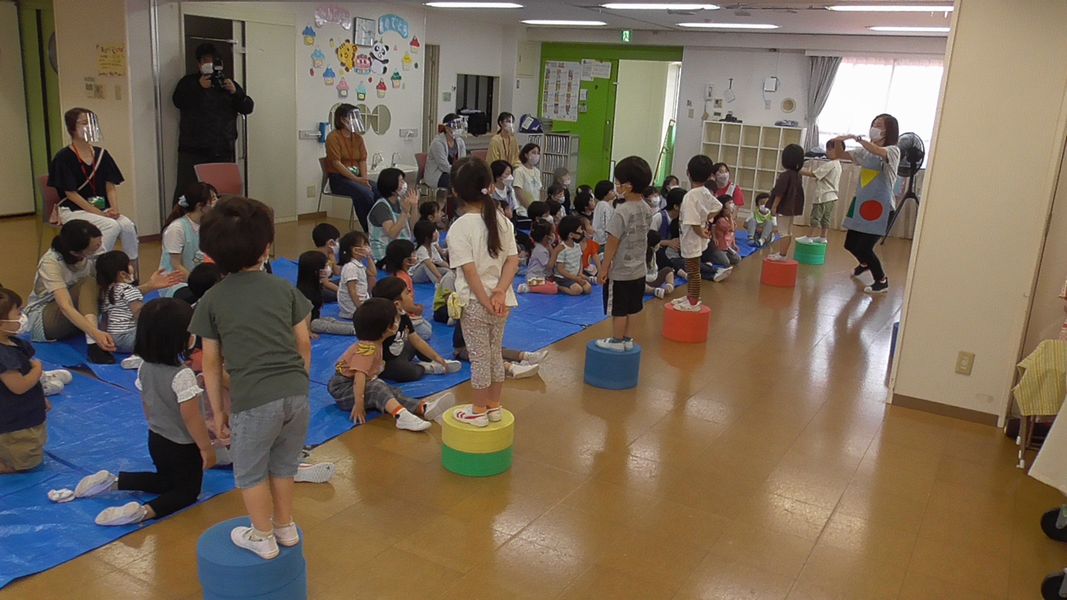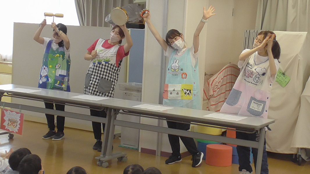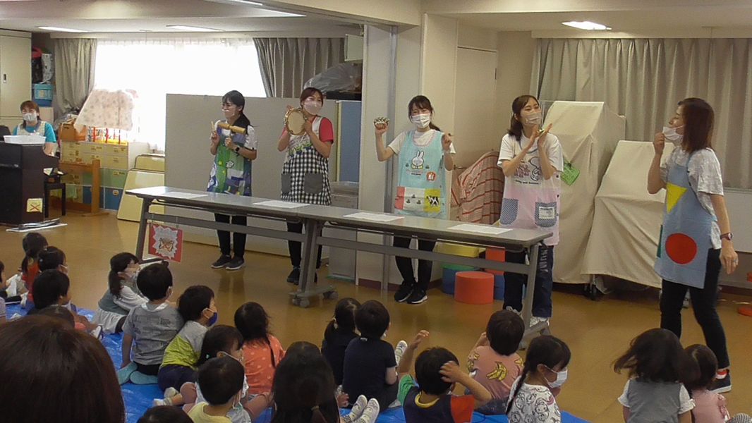 誕生児を紹介すると今度は、年少組の先生たちによる「お楽しみ」です。今月はとなりのトトロのオープニング曲でお馴染みの『さんぽ』に合わせた合奏を披露しました。