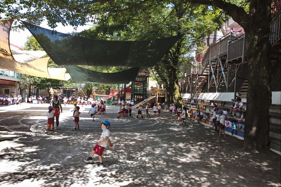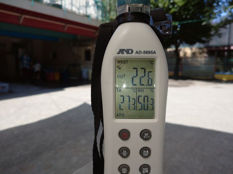 また、園庭はシェード(日よけタープ)が張ってあり日影が多く安心して遊べますが、園では毎日WBGT計測器で熱中症指数を図り熱中症対策をしっかりと行って遊んでいます。