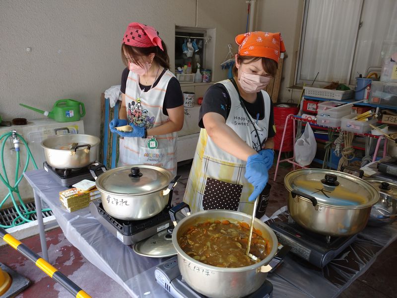朝、教師総出で野菜をきり、お肉を炒めたら、年中組と年長組のフリーの先生と主任が調理を担当して美味しく仕上げました。