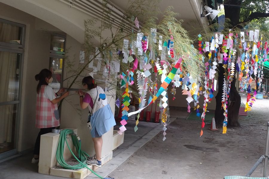 コロナ禍でずっとできなかったので、園庭に飾り付けるのは本当に久しぶりです。お迎えにいらした保護者の皆さんは一生懸命お子さんの短冊を探しあてると写真に収めていらっしゃいました。