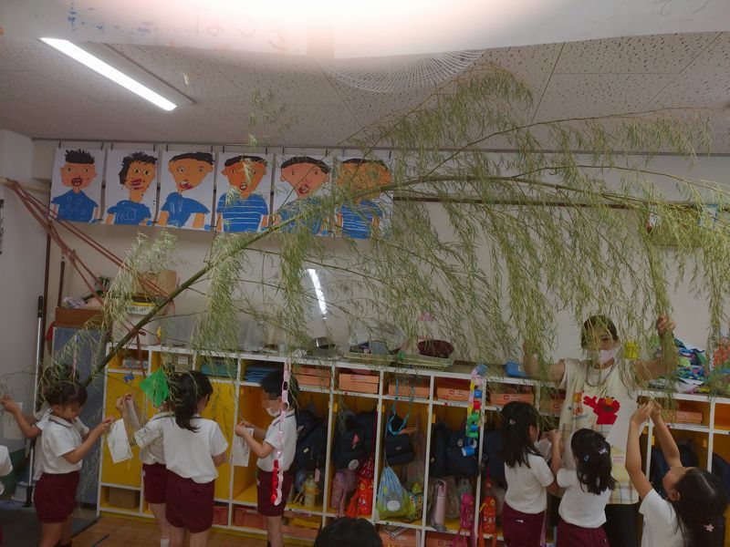 明日は7月7日七夕です。各クラスでは、月曜日にご近所から分けて頂いた笹竹に付ける飾りを製作したり、短冊に願い事を書き込み飾り付けました。