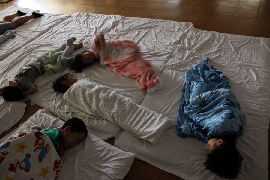 『お泊まり会』2日目の朝は気温が低く爽やかです。夜なかなか寝付けなかった子どもたちもぐっすり寝入った様子。でも、5時前に目が覚めてしまった子が何人もいました。
