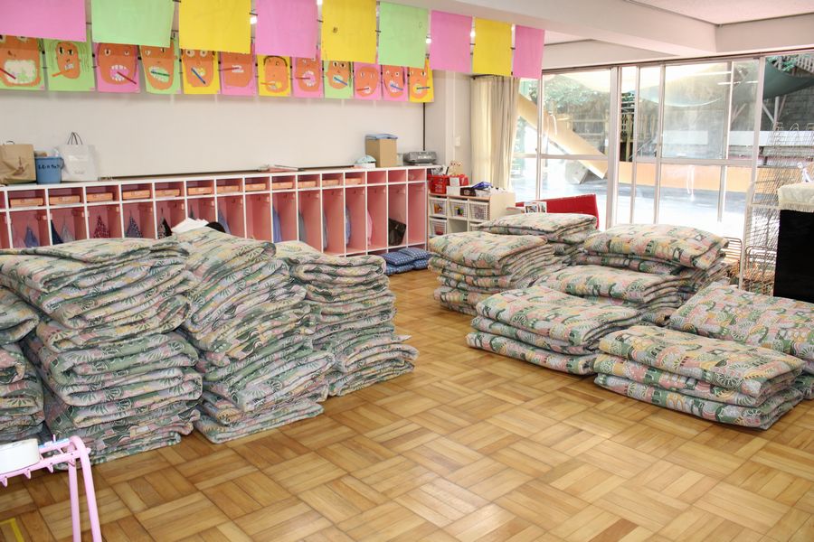 園児と教師の布団とシーツ約110人分が一部屋に集められるとこのボリューム。これらは後程教師総出で貸し布団業者のトラックに運びます。
