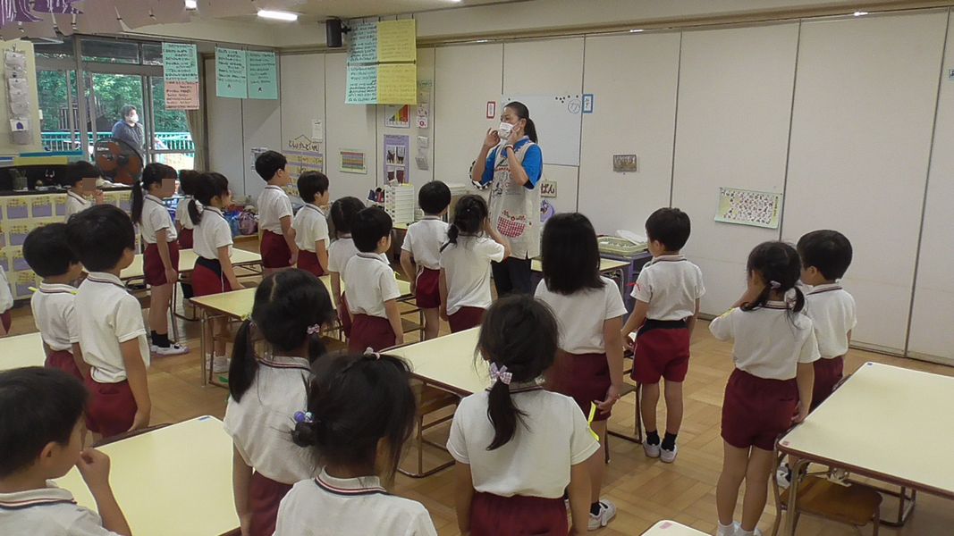 朝の会では布団係の号令で朝の挨拶を交わした後、いつも歌っている「夜が明けた」やお泊まり会のテーマ曲となっている「だいだいだいぼうけん」の歌を歌って目を覚ましました。