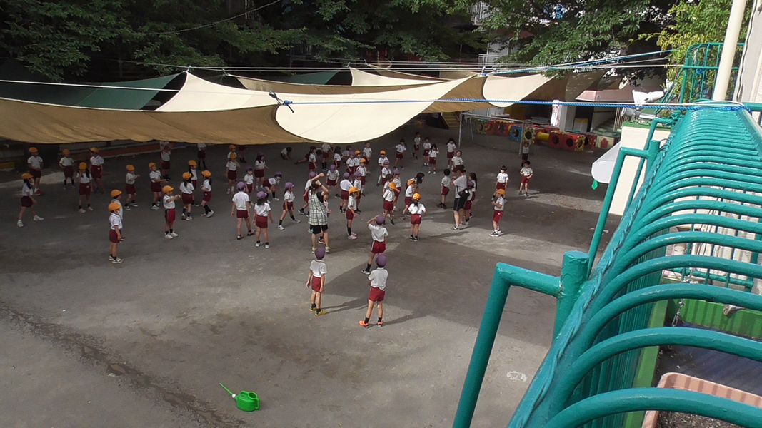 今朝は涼しかった事もあり、朝食係が朝ごはんの配膳のお仕事をしてる間、園庭に出てひと回り朝のお散歩を楽しみました。