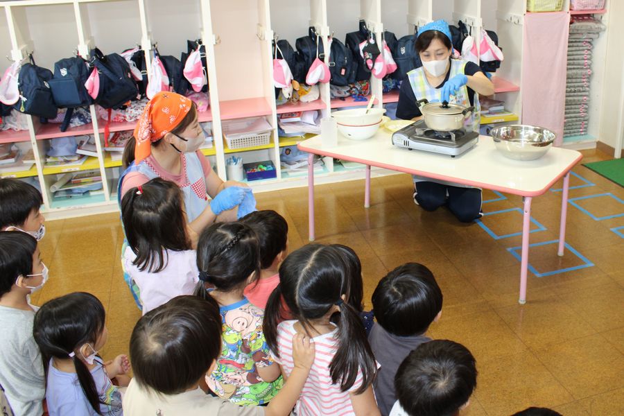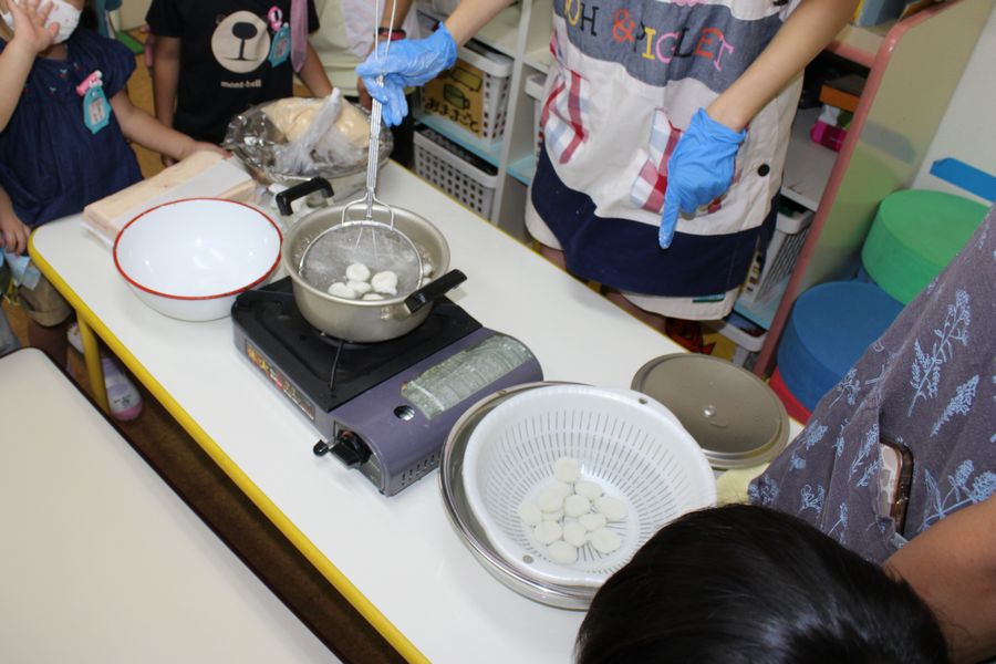子どもたちは鍋の蓋を空けて湯気がでる瞬間に大興奮。先程教師が作った白玉を茹でて、冷水で冷やす行程を見学しました。