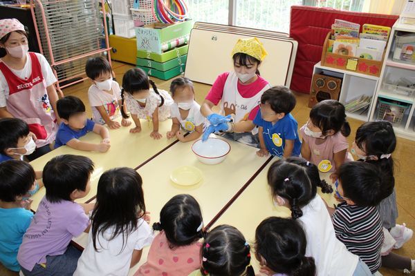 目の前で作ったものは教師用のもので、職員室の先生方にもおすそ分けしました。子どもたちの分は、前日から作り置きして冷やしておいたものに味付けします。