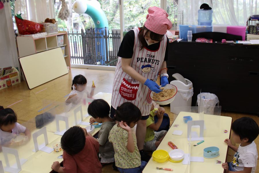 「はやくたべたーい!」と、子どもたちも待ちきれない様子。今回は先生方特製の甘辛タレのみたらし団子と黄な粉味の二種類に舌鼓をすちました。
