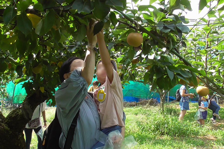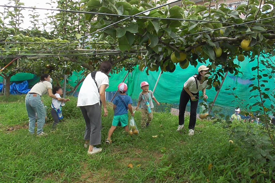 天候にも恵まれ、年少組が実に4年ぶりに『親子梨狩り』を実施しました。場所は有馬7丁目の有馬中学校の真横にある正果園(せいかえん)という梨園です。