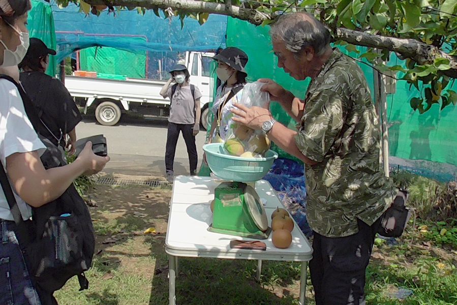 そして収穫した梨はその場ですぐに計り売りして購入します。価格も1㎏600円と大サービスのリーズナブルな特別価格で販売して下さり、お母様方も大感激。