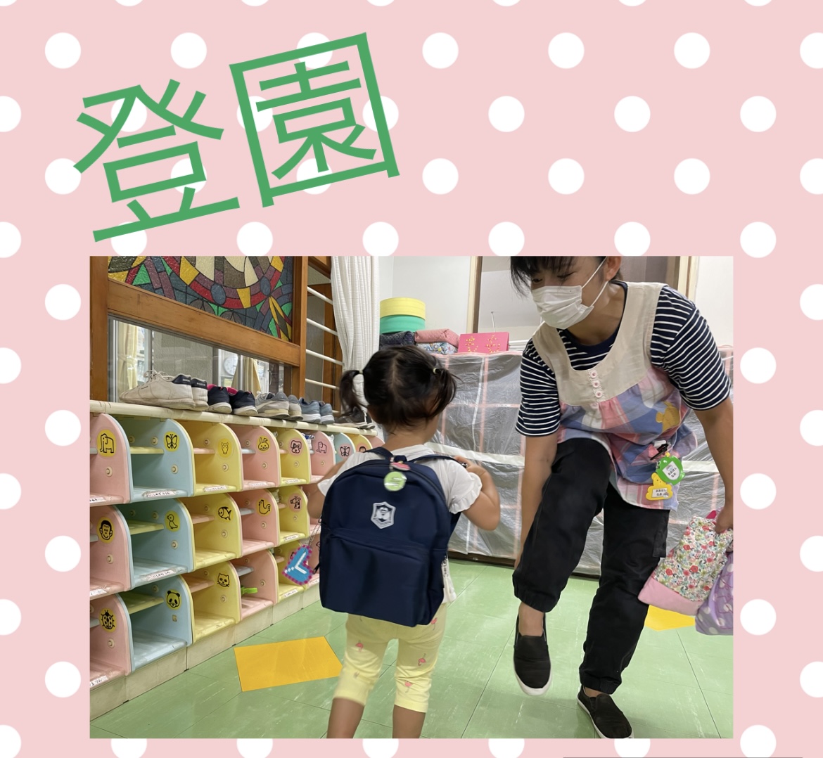 「おはよう!」今日も元気に登園してきます。おそろいのリュックに自分のマークがついています。