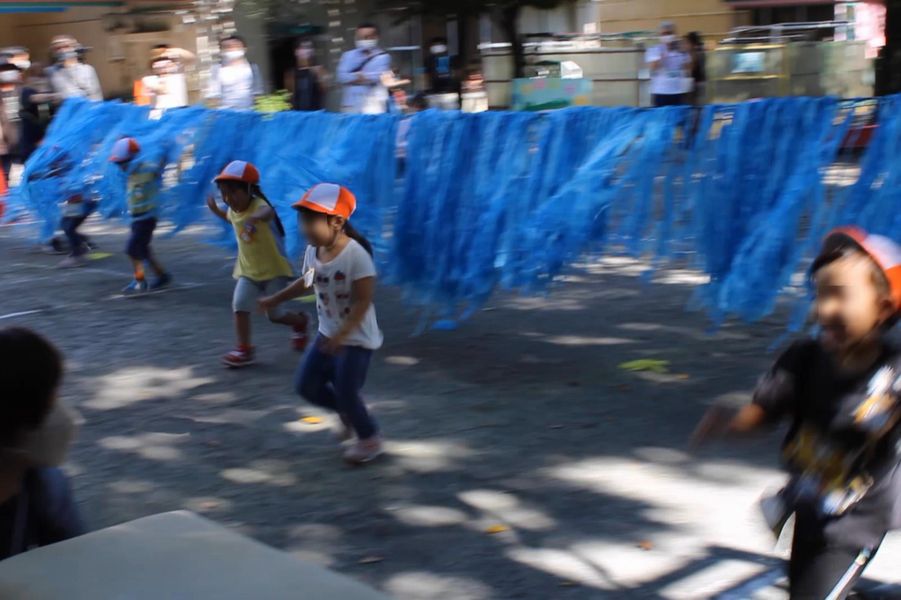 年少組のうんどうかいのテーマは『海』です。次は波を潜り、サンゴの山(跳び箱)を乗り越えて行く障害物の種目です。