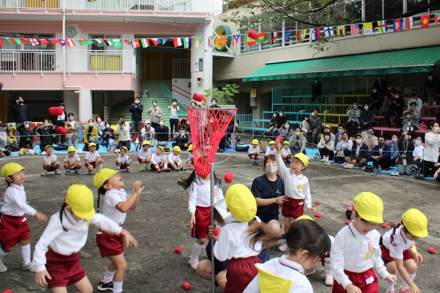 午前中は年中組の部を開催しました。玉入れ、カラテ太鼓、かけっこの3種目を行いました。