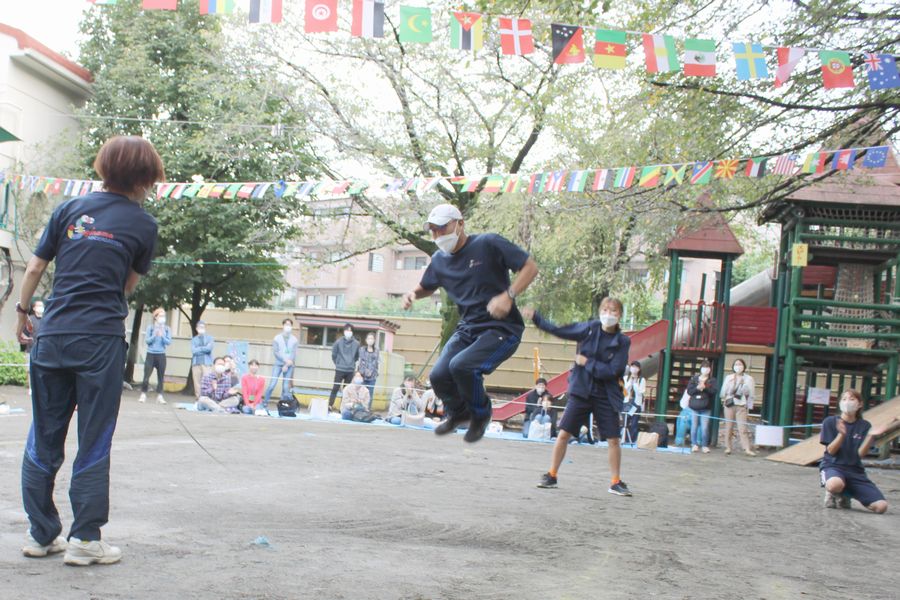 子ども達の休憩時間をとるために、教師による大繩跳びチャレンジがあり、47回目の開催を祝し47回連続跳びに挑戦しました。副園長と園長も飛び入りで参加して会を盛り上げました。