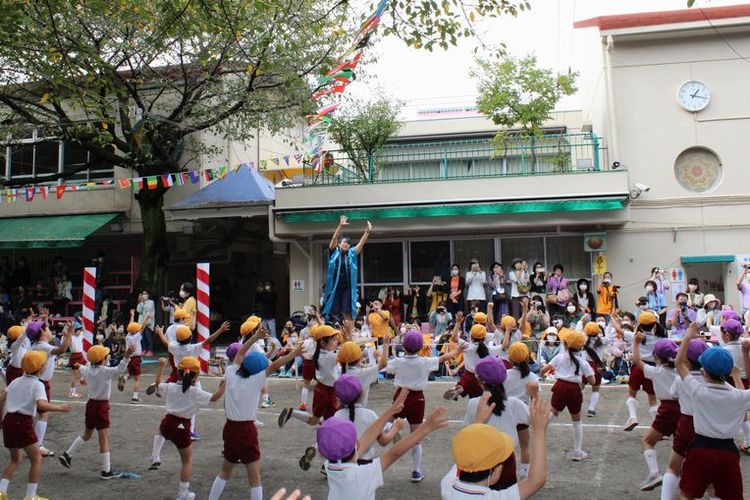 午後の部の年長組はピシッとした行進で入場したあと、全員で準備体操をして、大好きな『うーわっ!』のリズムを元気よく踊りました。