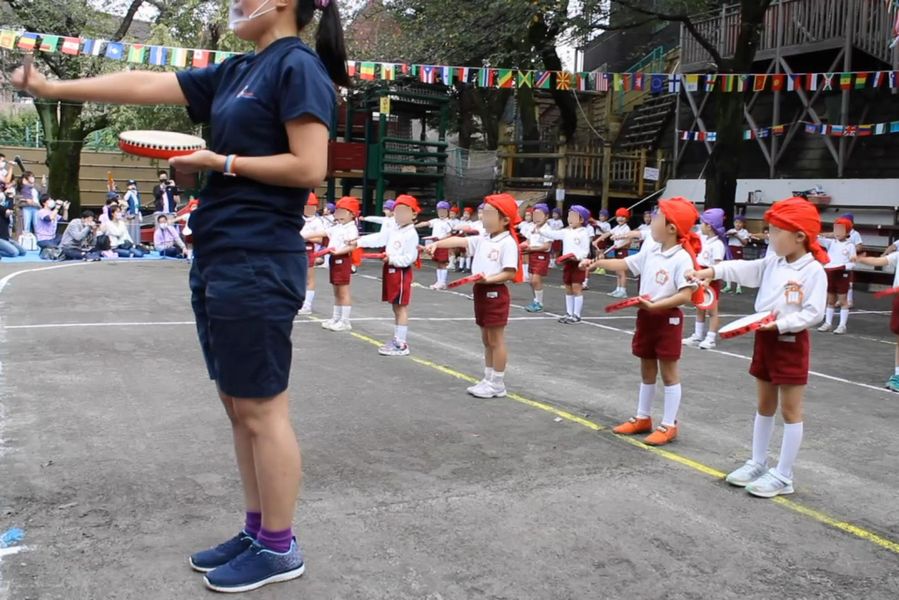 続いての演目は沖縄民舞『さぎぬまエイサー』です。パーランクと呼ばれる小さな太鼓を叩きながら踊ります。太鼓は保護者が手作りして下さったものです。