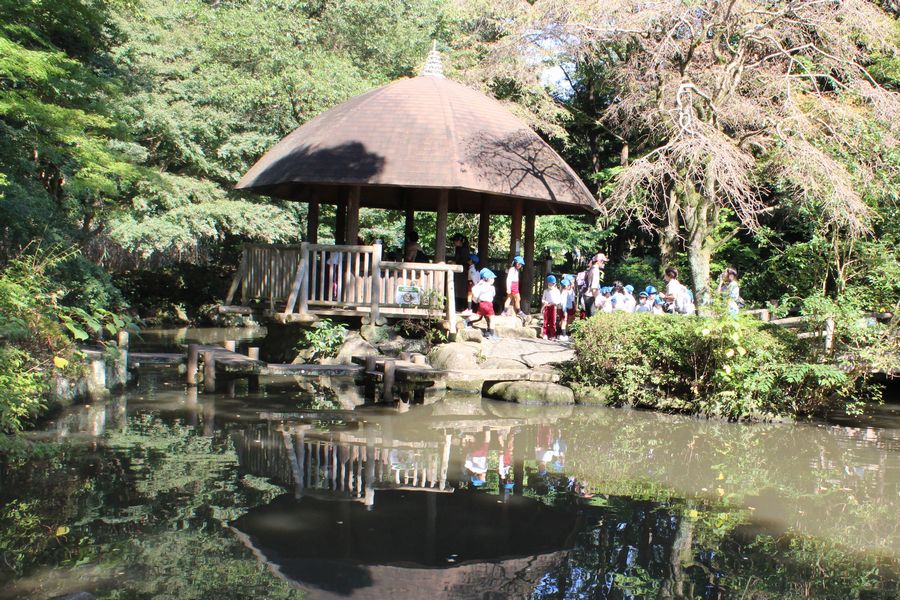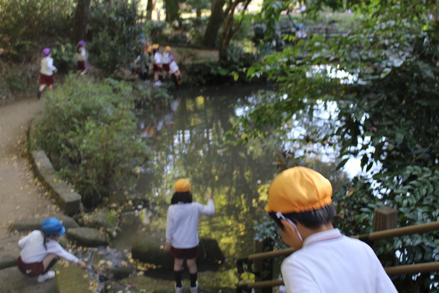 あずまやのある自然池泉には大きな鯉が生息していて、子ども達が集まるとエサをくれるかと勘違いして鯉が沢山集まってきました。
