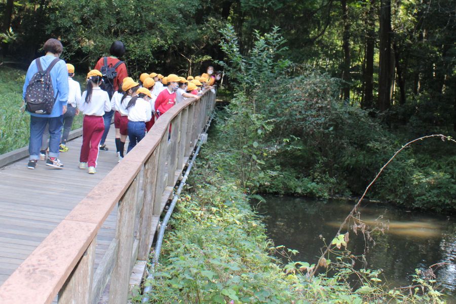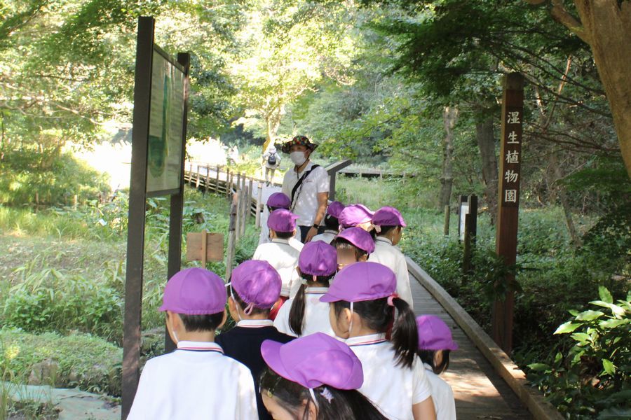 まず最初はクラス毎に、広大な敷地内にある湿生植物園の木道を先生や帯同して下さった保護者の方と一緒に散策して回ります。時折足を止めて珍しい植物や生き物を観察しながら、大自然を満喫しました。