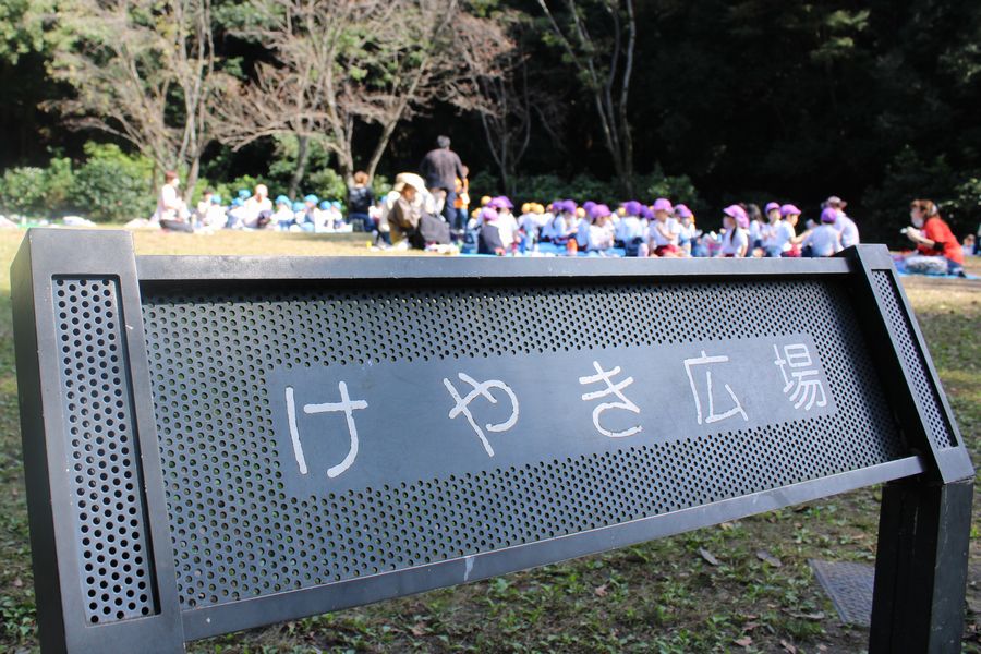 昼食は拠点にしている『けやき広場』に大型ビニールシートを敷き、クラス毎におにぎり弁当をいただきました。遠足の日はデザートやフルーツ、お菓子もOKです。
