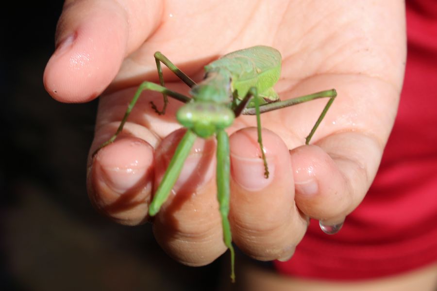 ハラビロカマキリは虫好きな子どもがテストすると、お尻からカマキリに寄生するハリガネムシが出てきて子ども達も教師もびっくりしました。