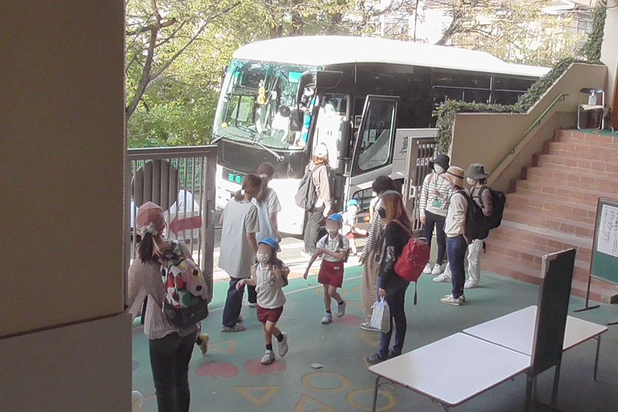 広い公園内を縦横無尽に走り回って大自然を満喫した年長組の子ども達。くたくたになるまで思い切り遊びました。帰りのバスは許可証を取り幼稚園前まで配車してもらい下車しました。