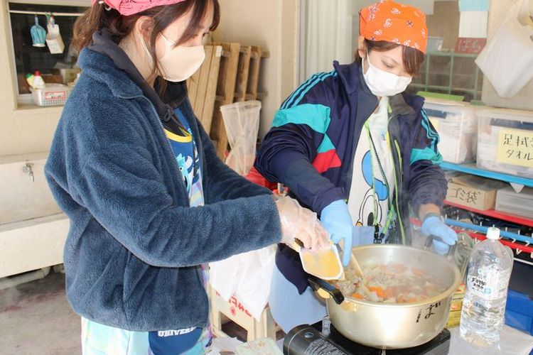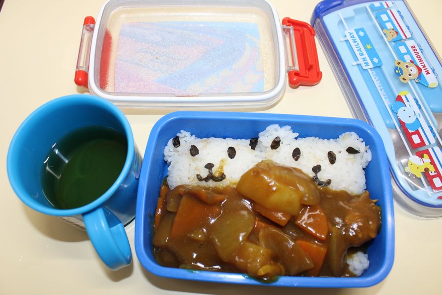 でき上ると、自宅から我が子に合わせ持参してもらった適量のご飯にカレーをかけてもらいいただきます。カレーは大好きなので大きめのタッパー入れ持参してきた子もいました。