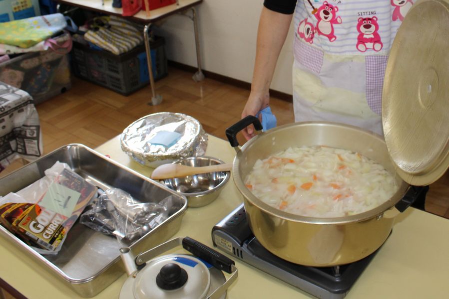 年中組分のカレーは園庭のピロティにカセットコンロを並べてフリーの教師が調理します。年少組のカレーは職員室の台所で副園長が担当。