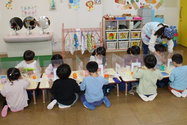 登園では学期に一回、全園児で同じものを食べる行事を行っています。材料の野菜は前日に年長組の子どもたちがジャガイモを洗ったり、玉ねぎの皮むきをして下準備してくれました。