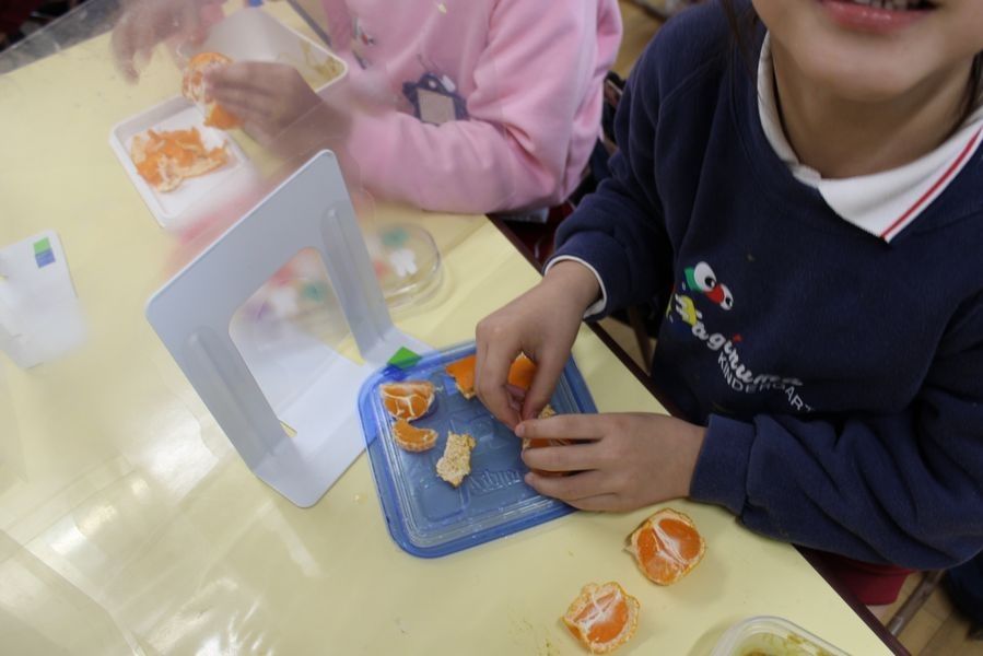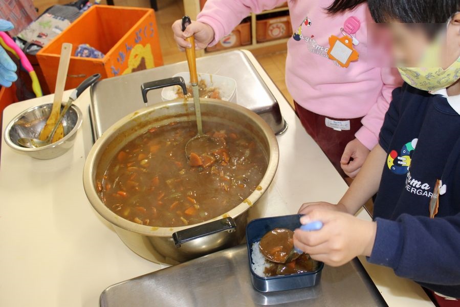 年長組は熱々のカレーをお玉でよそう体験もしました。そしてデザートには冬の味覚のミカンも出て食後に美味しくいただきました。