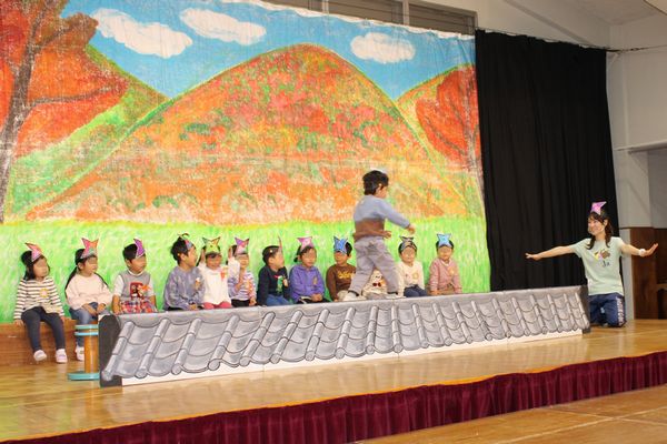 年少組は日頃の保育そのままの様子を劇遊びや見立て遊びとして構成し、担任も一緒にステージに上がって進めるスタイルです。