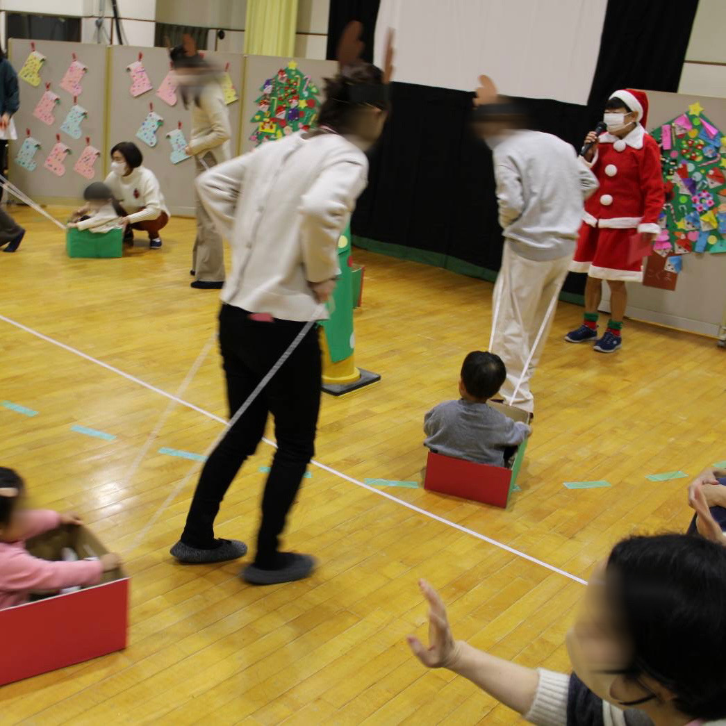 こどもたちのあとはお父さんお母さんがトナカイになってこどもソリを引っ張るゲーム