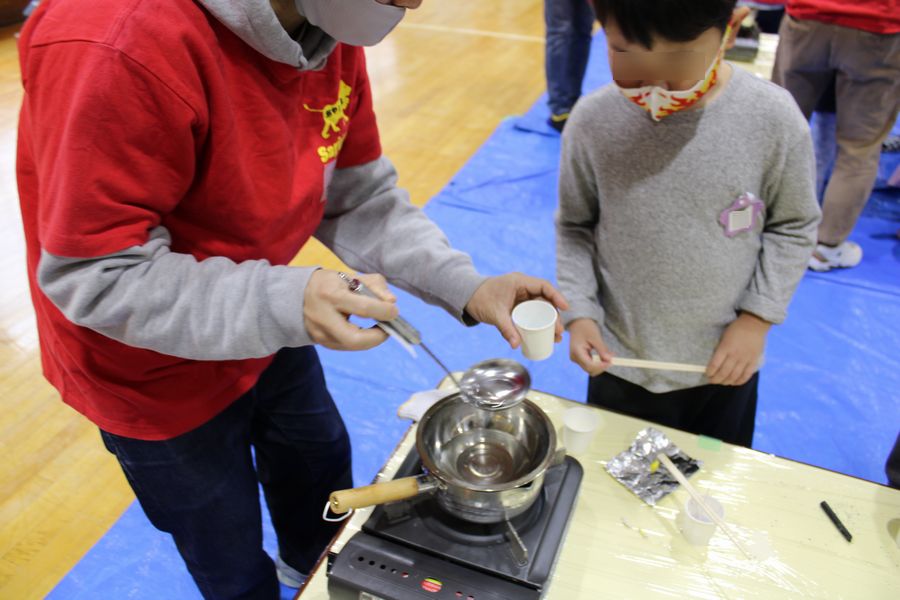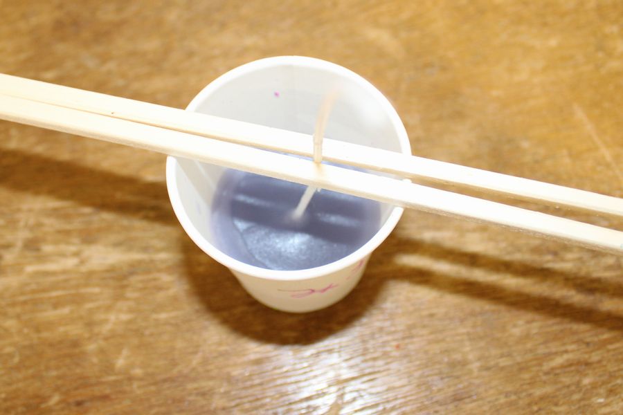 キャンドル作りは蝋燭の元を湯煎して溶かし、中央に芯となる専用の紐を入れ割り箸で固定して蝋を流し込みます。色付けのためにクレヨンを削って入れたり、ラメを入れてアレンジします。