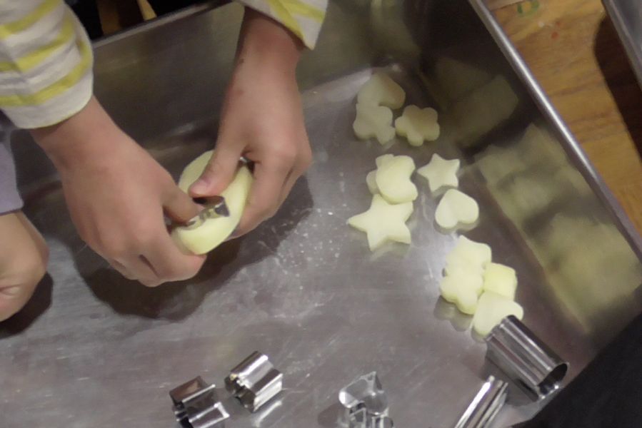 また人参とジャガイモは薄く輪切りにしたものが一旦体育室に運ばれて、子ども達が星型や花型など色々な型抜きも楽しんでいました。