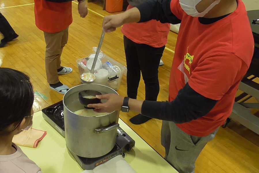 シチューはでき上ると熱々のうちに振舞われました。味付けはお料理が得意なおやじ倶楽部の会長さんが担当て大好評。体育室中がクリームシチューの美味しそうな香りに包まれました。