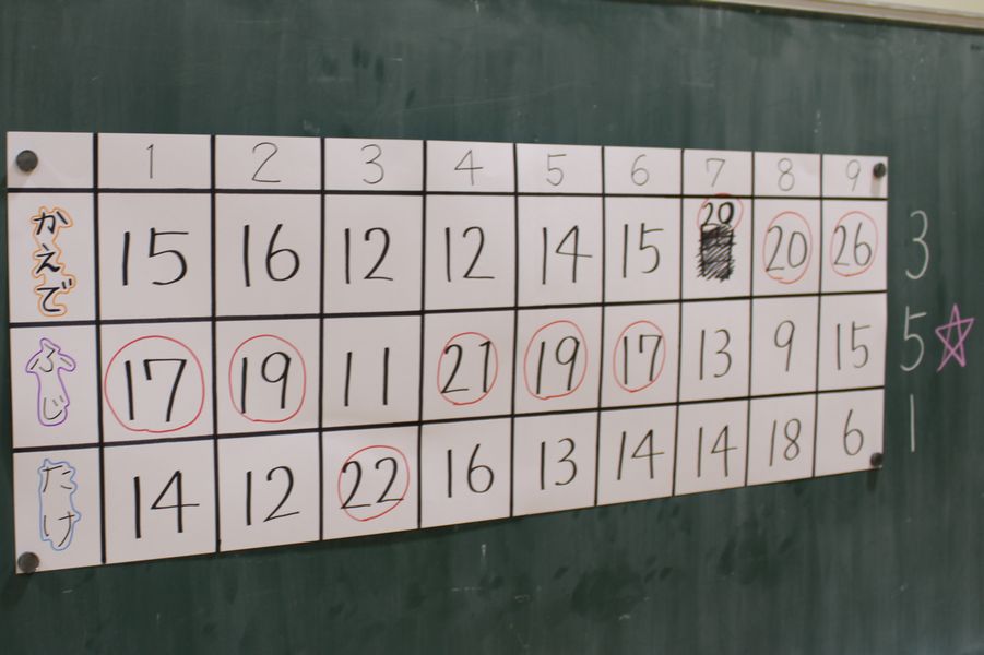 札が全て読み終わると獲得した札を各グループで数えテーブル毎に報告します。先生が一覧表に獲得した枚数を記入し集計し勝率で優勝クラスが決まります。