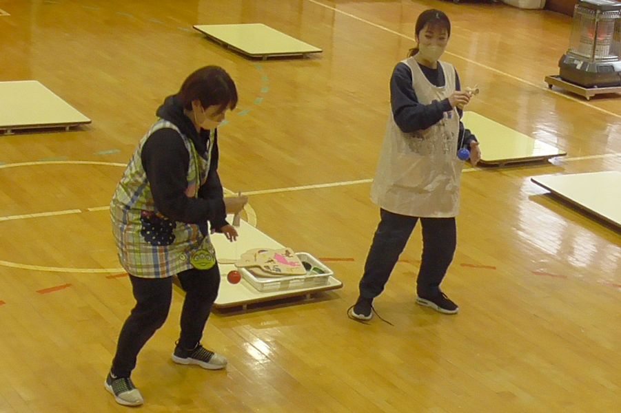 かるた大会に入る前に先生方から『お正月遊び』の紹介も行いました。お部屋様に新しく購入した『剣玉』や『独楽』など、先生方がパフォーマンスを見せて紹介しました。