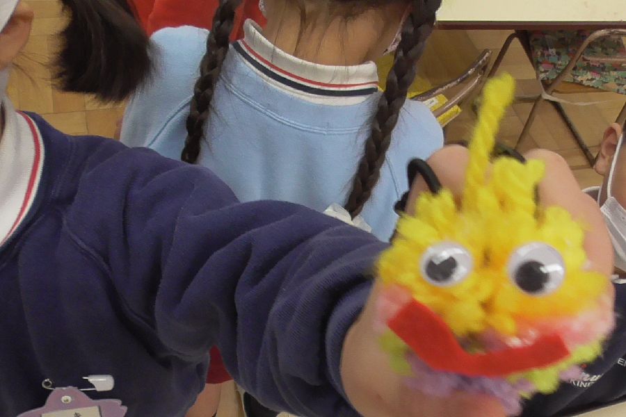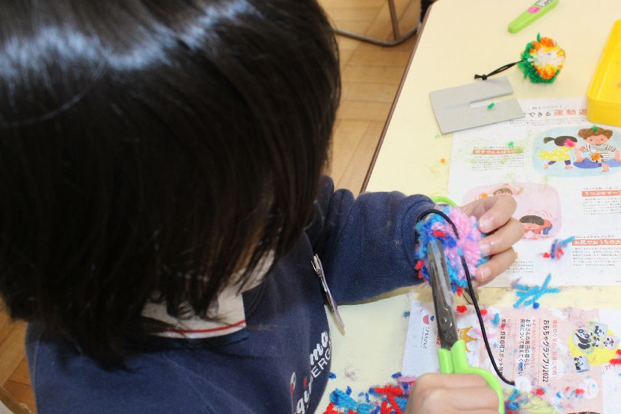 「ポンポン人形」はハサミ使いがポイントです。子ども達は真丸になる様に少しずつ毛糸を刈り上げていき、仕上げに木工ボンドで目をつけて可愛い人形のキーホルダーに仕上げました。