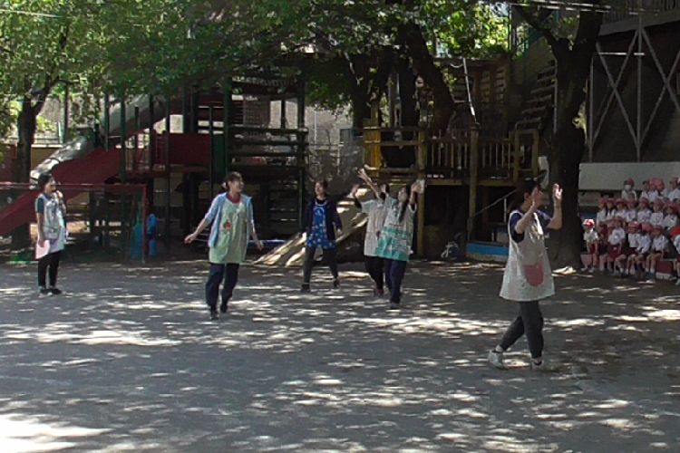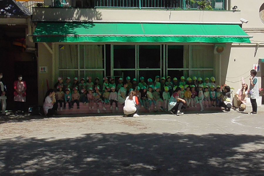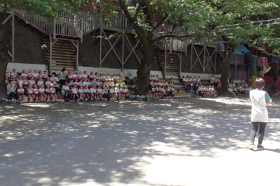 まずは司会の教師が年長組の各クラスの名前を呼んでご挨拶。続いて年中組とすっかり幼稚園生活に慣れてお弁当も始まった年少組も大きな声で返事をしました。