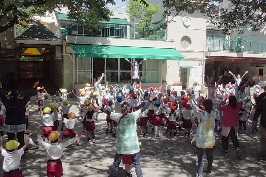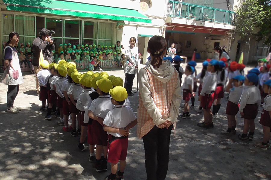 に各学年の先生方やプレイルームの先生方を紹介すると園庭の中央に出てきて初対面。最後に園長も呼ばれて、子どもたちに向けてお話をしました。
