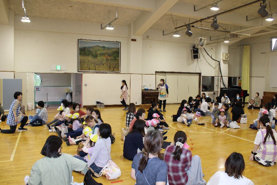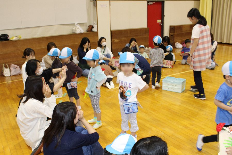 5月の第2日曜日は『母の日』です。年少組が『母の日』に先駆け、体育室に集まって『親子の集い』を行いました。