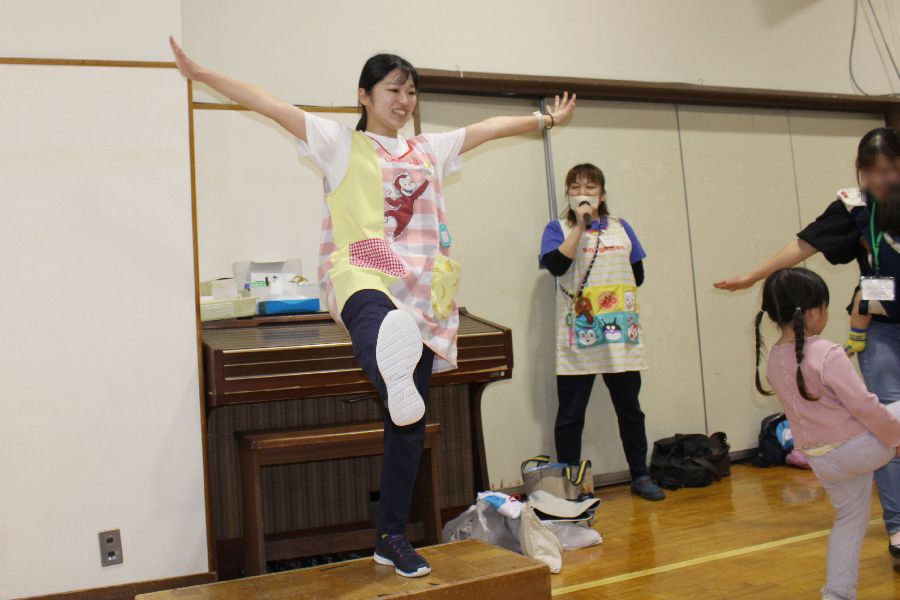 子どもたちはお母さんと一緒なので嬉しい気持ちと照れ臭い気持ちの両方が入り混じっている様子でした。まずは一緒に普段踊っている『たけのこ体操』と『ディズニー体操』を踊りました。