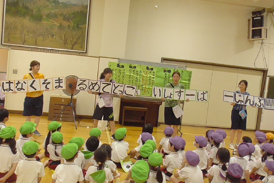 青少年の家に出発する午後3時頃までは園内で過ごします。今日は年長組の先生だけでなく年少組、年中組や園長、副園長も年長組が独占。対決したりクイズをしたり楽しく過ごしました。