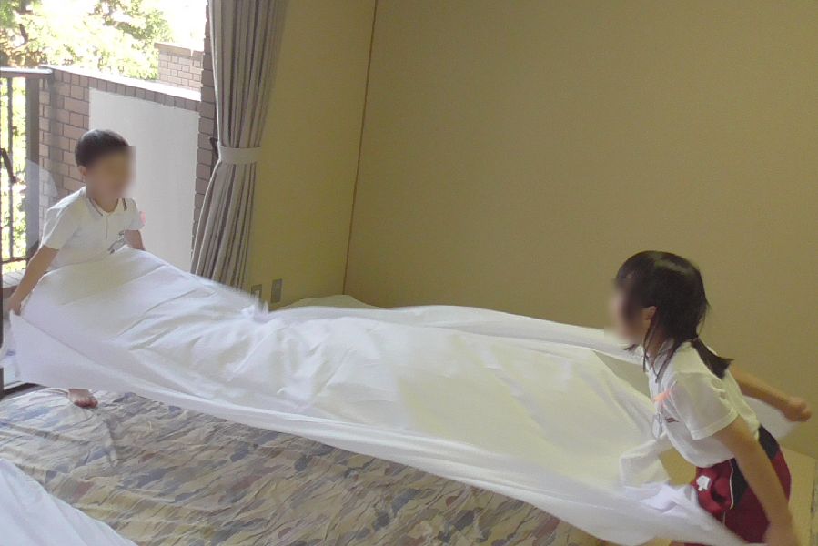 青少年の家に到着すると皆割り当てられた係のお仕事をこなします。まずは布団係が宿泊する部屋全部の布団を敷きシーツを被せました。