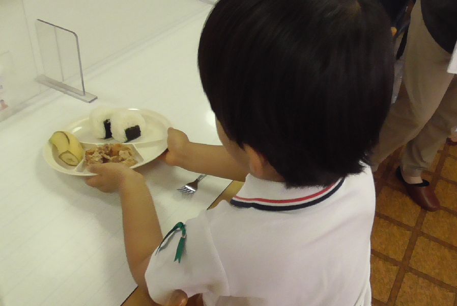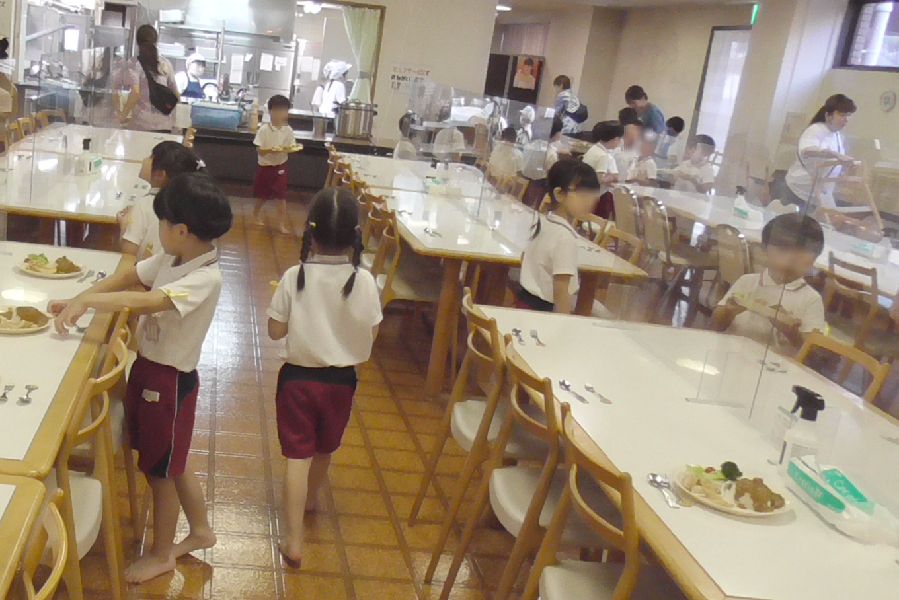朝食も朝食担当の子どもたちが配膳のお仕事をしました。配膳するコップは瀬戸物でしたので落として割らないよう慎重に運びました。